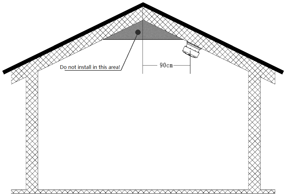 Pokud instalujete alarm kouře na šikmém nebo špičkovém stropu, musí být montážní poloha alespoň 90 cm od nejvyššího bodu.